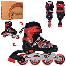 раздвижные, шнуровка+бакля, алюм.рама, колесаПУ64мм, 1свет, длина стельки 16см, комбо, красный, в кор-ке