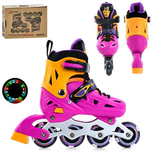 розсувні, шнурівка+бакля,алюм.рама,колесаПУ64мм світло, устілка 20см, фіолет+помаранч, в кор-ці