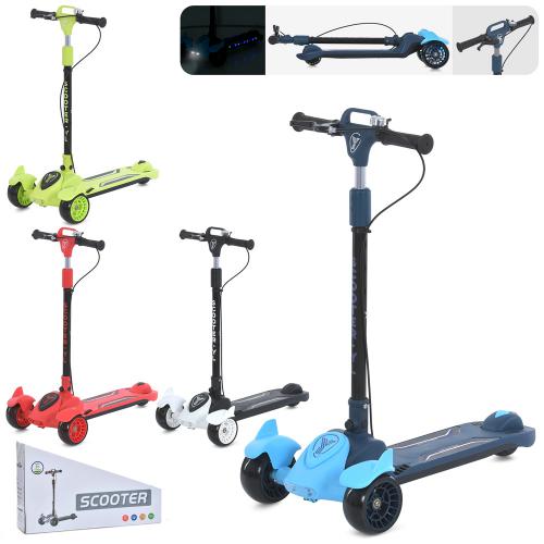 Maxi-big, метал+пл, 3 кол,2 пер.ПУ 130мм- світло, заднє 90мм-світло, підніжка 35-14см-музика, кермо 5 положень (1полож.78см, 5полож. 97см), бампер-світло, ручне гальмо, гальмо на задн.колесі, складний, дзвоник, 4 кольори, на бат-ці