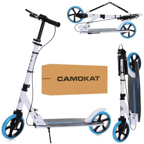 алюм+сталь, 2колесаПУ200мм, руль89-100см, подножка55/33-15см, ширина руля39см, подставка, ручной тормоз, белый с синим