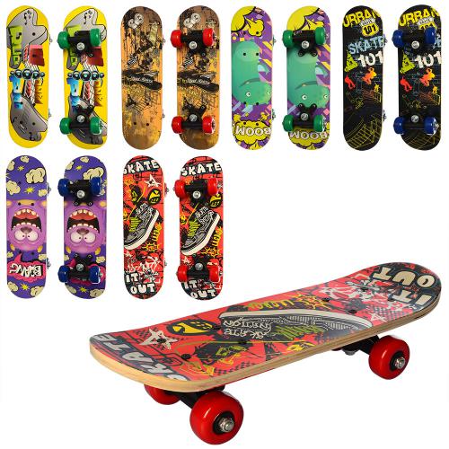 Скейт детский, размер доски 43-13см (7 слоев китайского клена), верх рисунок, пластик. подвеска, цветные колеса ПВХ 45 мм, до 20кг, разобранные, 6 видов