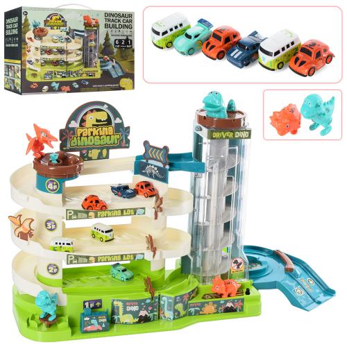 3 поверхи, 56-18-в32см, муз, звук, світло, ліфт, динозаври, ігрове поле, машинки 4см 6шт, на бат-ке, в кор-ке
