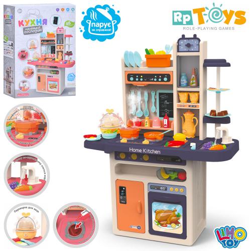 93,5-71-28,5см, мийка-ллється вода (механічні), духовка, плита-пар, посуд, продукти, яйцеварка, годинник, дощечка для малювання, годинник, крейда, губка, 65 предметів, музика, звук, світло, на батарейці, в коробці