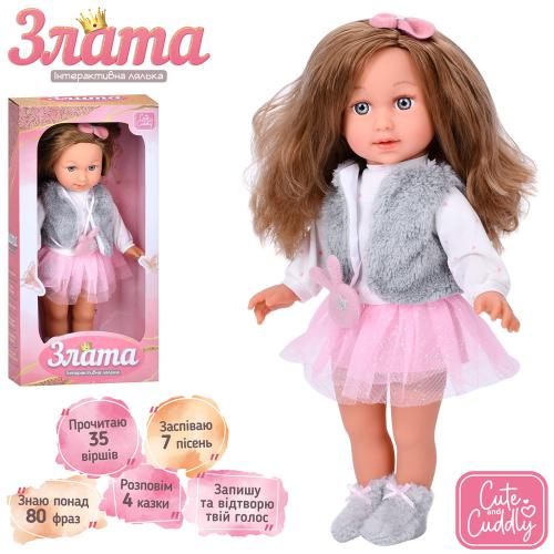 Злата, 40см, м'яконабивна, інтерактивна, музика, звук(укр), пісні, вірші, казки, повтор, загадки, відповідає на питання, знає англійську мову, на бат-ці, в кор-ці