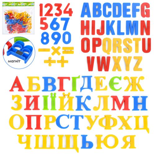 Набор магнитный БУКВЫ-ЦИФРЫ, рус/англ/укр буквы, цифры, математические знаки, в кульке
