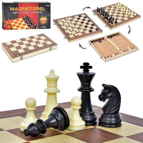 3в1(шашки, нарди), ігрове поле (дерев), фігури-пластик, шахові фігури-магнітні, в кор-ці
