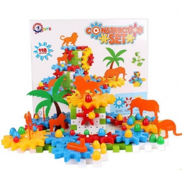 Конструктор з шестернями «ТехноК» дарує дітям подвійну радість. 118 яскравих деталей з якісної пластмаси значно урізноманітнять процес складання конструктора та захопливі ігри з ним. Після того, як дитина об’єднає шестерні, пластини-пазли, фігурки звірів, пальми та інші елементи конструктора, вона отримає захопливу конструкцію, якою дуже цікаво гратися.