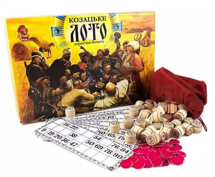«Козацьке лото» - гра, призначена для підняття настрою у великій та веселій компанії, захоплює своїм азартом та динамікою. Як будь-яка динамічна та азартна гра має безліч варіантів. Матеріал виготовлення барил - тверді породи екологічно чистих дерев (бук, береза), які не викликають алергії. Комплектація: дерев'яні барила - 90 шт., картки - 24 шт., фішки - 100 шт., мішечок - 1 шт., інструкція.