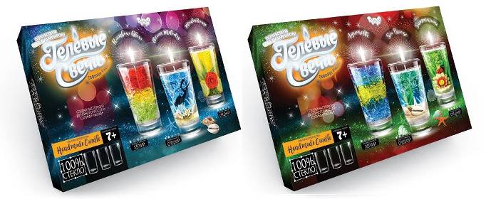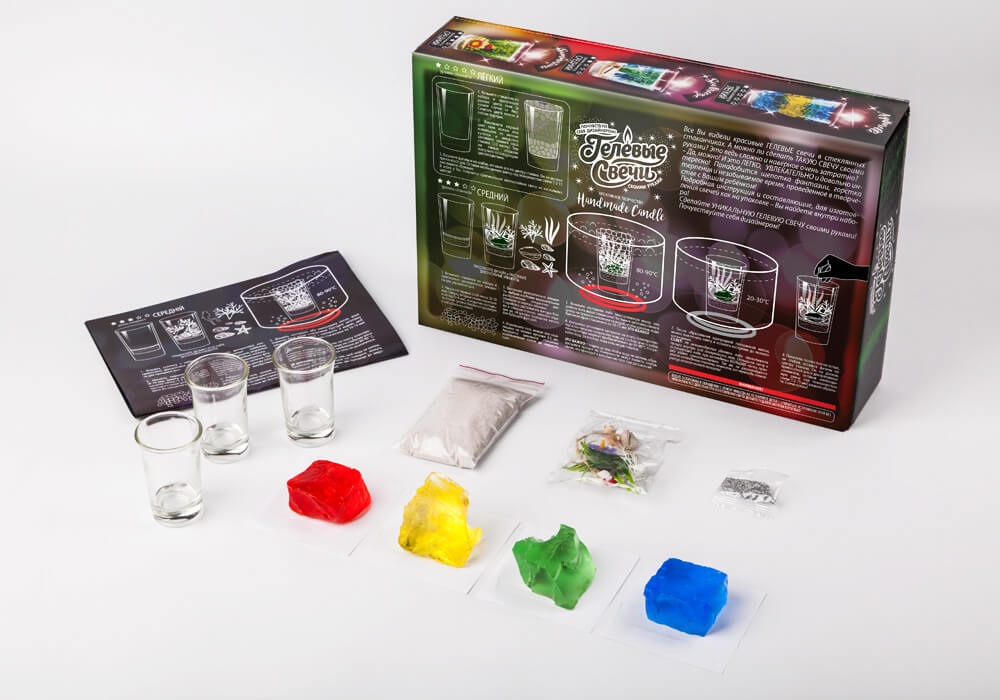 - стакан; - песок; - набор разноцветного геля; - фитиль; - глиттер; - пластиковые цветы и фигурки; - инструкция. гелевые свечи