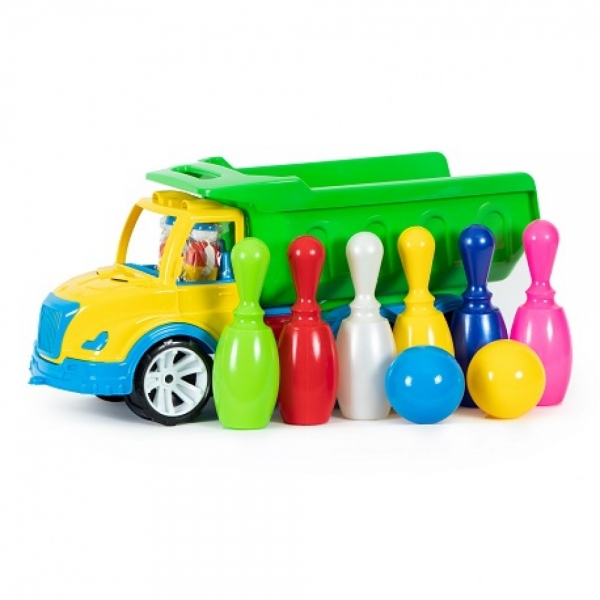 грузовик, самосвал, кегли, боулинг, цветной, мати, в сетке