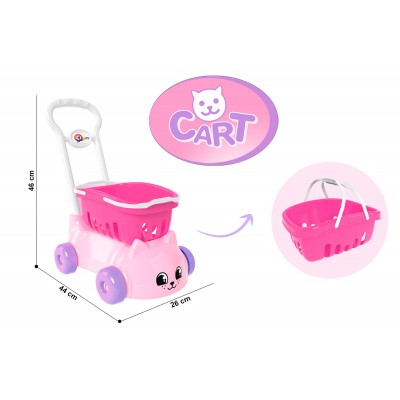 На тележке надёжно закреплена удобная корзина с ручками. Интересно, что корзиночку можно снять и играть отдельно. В ней удобно переносить фрукты, овощи, посуду, песочные наборы и другие игрушки. Размер корзиночки позволяет брать её на прогулку, в песочницу или в детский сад. Особенностью тележки является милый дизайн «котик». Ушки и изображения мордочки непременно привлекут внимание малышей.