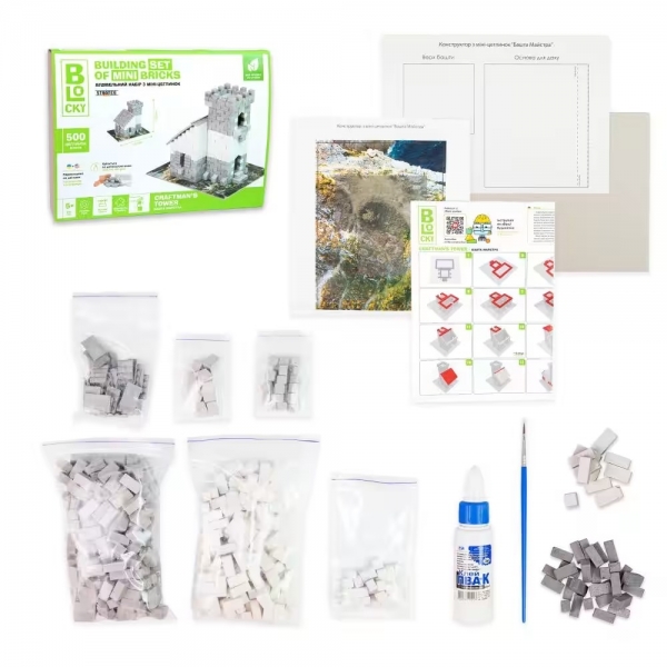 ♦ Комплектація: коробка, цеглинки - 500 ел., клей ПВА, пензлик - 1 шт., інструкція.