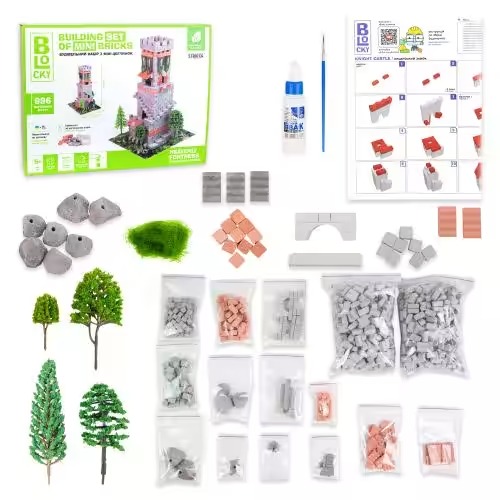 Комплектація: коробка (виготовлена з картону), цеглинки - 996 шт. (виготовлені з гіпсу, води та барвника), клей ПВА, пензлик, комплект додаткових елементів (виготовлений з картону), інструкція (виготовлена за паперу).