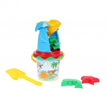 Основа игрушки - сито для песка. Комплектуется ведёрком с крупным рисунком, нанесённым по технологии IML, двумя пасочками и лопаткой.