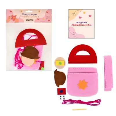 Комплектація: фетрова основа для сумки, елементи з фетру, декоративні елементи, нитки, пластикова голка.