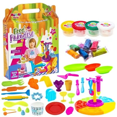 Солодкі пончики, морозиво, вафлі і печиво - хто з дітей не любить солодощі? Великий набір «Містер Тісто Food paradise» подарує дитині можливість відчути себе кондитером і майстром десертів, який створює солодкі шедеври на маленькій кухоньці! Це кондитерська в мініатюрі - в наборі є кондитерський шприц, скалка, кухонний набір, коробочки для готової продукції і підставка для кексів. А матеріалом, з якого дитина приготує свій солодкий шедевр, стане м'яке тісто. Воно відмінно ліпиться, не липне і не забруднює ручки. Тісто з блискітками приймає будь-яку форму, дозволить малюкові проявити найсміливіші фантазії!