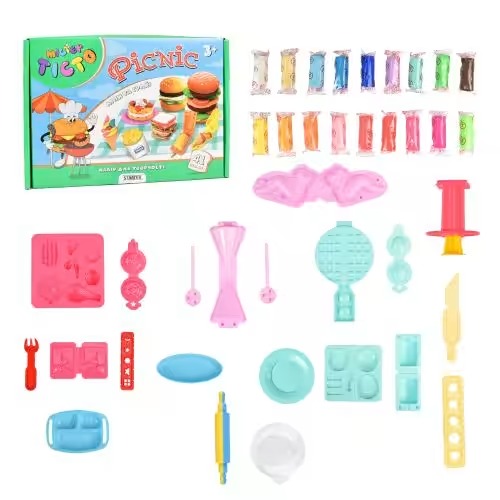 У комплект входить багато маленьких формочок для ліплення, які дозволять малюкам створити найрізноманітнішу “їжу” для пікніка: гамбургери, картоплю фрі та навіть “смажені” крильця.