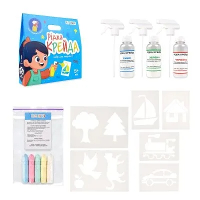 Творчий набір «Рідка крейда» перетворює звичайну пляшечку на чарівний інструмент для малювання. Просто додай воду та кілька крапель рідкого мила — і отримай яскраву, готову до розпилення фарбу. Створи власний шедевр за допомогою трафарету або фантазуй без обмежень!