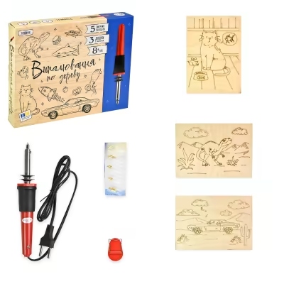 выжигательный прибор, 3 деревянные доски разного размера с рисунками, сменные насадки (5 штук)