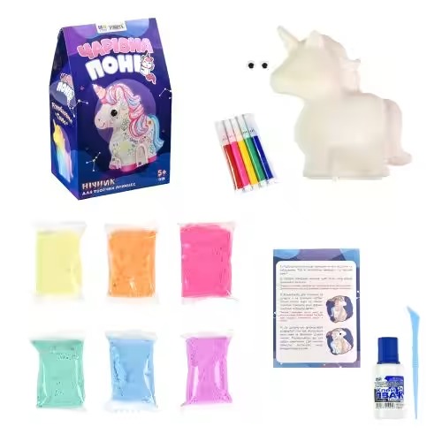 У складі набору ви знайдете нічник поні, який надає м'яке та комфортне освітлення. До нього додаються фломастери для малювання, клей для закріплення декоративних елементів легка маса для створення об'ємних прикрас.