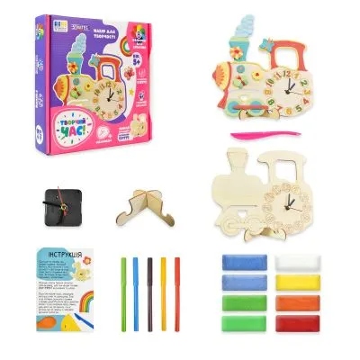 Набір для творчості «Творчий час. Парозик Тутті» — це чудова можливість створити свій власний унікальний годинник. Він стане прикрасою дитячої кімнати та допоможе малюку вивчити час. У наборі на вас чекає дерев'яна основа паровозика, годинниковий механізм, а ще повітряна маса та фломастери для прикрашання.
