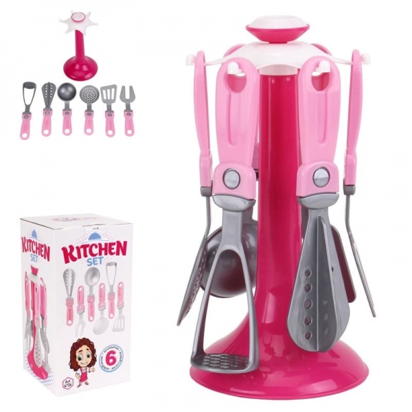 В наборе: стойка, черпак, шумовка, вилка большая, лопатка, венчик, толкушка.