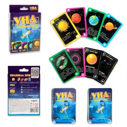 Настільна гра «Уна космічна» - оновлений варіант всім відомої класичної гри «UNO». Однак є приємний бонус: на картках ви знайдете цікаву інформацію про планети, зірки та астероїди. Це дозволить вам не тільки весело провести час, але й отримати нові знання. Гра «Уна космічна» розважить вас у приємній компанії, а також допоможе поринути у світ космічних пригод!