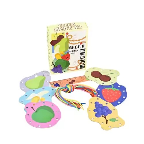 коробка, картки-фрукти, шнурочки, інструкція.