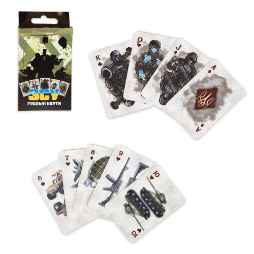 Настільна гра карти "ЗСУ" (Strateg 30287) – це колода карт із унікальним дизайном, який віддає належне збройним силам України. На картках зображенні наші військовослужбовці, які боронять нашу неньку. Ця колода є чудовою ідеєю подарунка для тих, хто цікавиться виробами на патріотичну тематику.