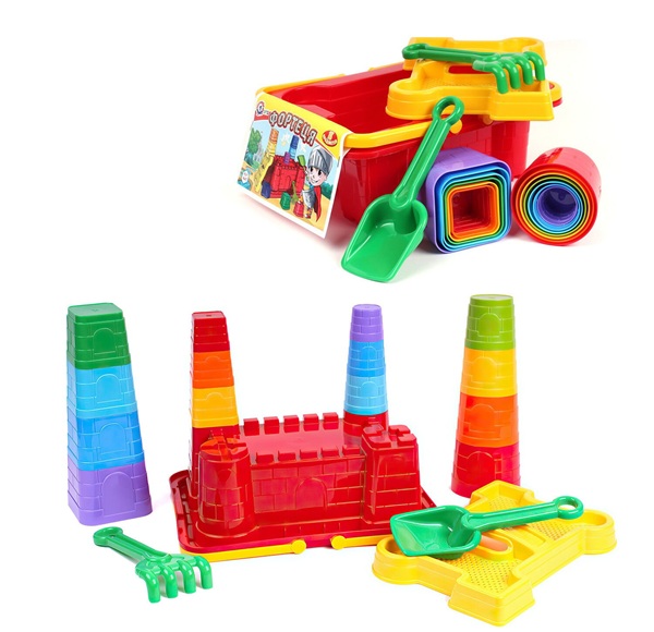 Игровой набор «Крепость» прекрасно подходит для активной игры как дома, так и на улице. Он состоит из 18 элементов: оригинального красного ведерка, в форме средневековой крепости с четырьмя башнями; 14-ти классических песочек-пирамидок, квадратной и округлой формы, которые своей формой будто имитируют башни средневекового замка; крышки-сита в форме рва с мостиком и грабельки с лопаткой.