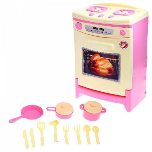 Електрична іграшка (з електричним звуковим сигналом) -плита, довжина - 315 мм, ширина - 215 мм, висота - 470, маса в споживчій упаковці - гофрокороба спеціальному - 1,835 кг або в пакеті з плівки ПВХ - 1,578 кг. Іграшка Плита складається з корпусу, задньої стінки, газової плити, дверцята духовки і панелі управління. Газова плита встановлюється зверху на корпус і має дві газові конфорки з двома решітками, а також, три ручки з фіксованими положеннями для управління. Дверцята духовки встановлюється на корпус попереду і може відкриватися. Панель управління встановлюється зверху дверцят духовки і має кнопку електричного звукового сигналу (ліворуч), ручку управління (праворуч) і наклейку - імітаційне табло з програмним управлінням. Ручка управління має кілька фіксованих положень для установки імітації режиму роботи духовки. Електричний звуковий сигнал харчується від двох мініатюрних (у вигляді монети) гальванічних елементів живлення по 1,5 вольта DC. Звуковим сигналом можна поінформувати про початок роботи духовки. Усередині духовки є дві перфоровані полки для посуду. Плита комплектується набором кухонного посуду: дві каструлі - велика і мала з кришками, сковорода, чайник, 2 ложки, 2 вилки, 2 ножі, лопатка і черпак. Всі деталі іграшки виготовляються методом лиття під тиском з поліпропілену