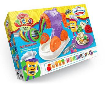 тісто для ліпки, пластилин, масса, тесто в баночках 5шт, тесто в брикетах 15шт, станок с формами для лепки 1шт, насадка для станка 4шт, тарелка 2шт, вилка 1шт, нож 1шт, инструкция 1шт