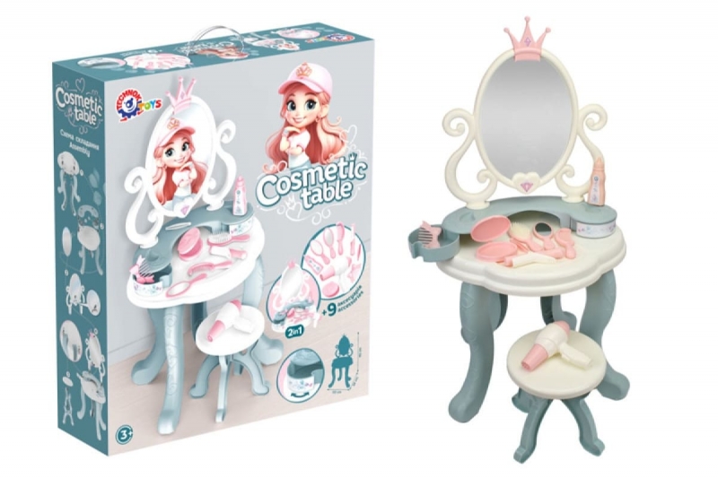 Розвиток та навчання у грі: Косметичний столик сприяє розвитку уяви, творчості, дрібної моторики та соціальних навичок. Діти зможуть імітувати процес нанесення макіяжу, приміряти різні образи, розвиваючи свій естетичний смак та впевненість у собі. Це чудовий спосіб навчитись доглядати за собою та взаємодіяти з іншими через рольові ігри.